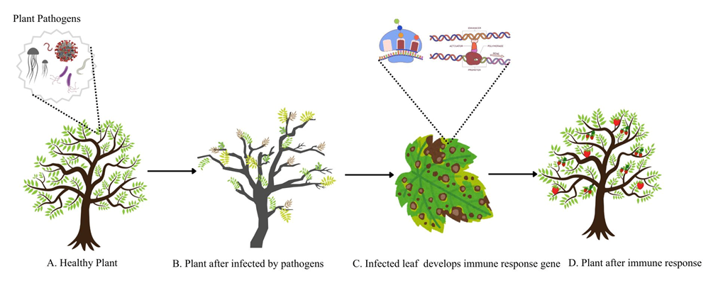 Plants are always calm and silent, but an immune response always active inside them. Microbial bodies attempt to enter the plant and make it sick. Under such conditions, the plant immune system recognizes and tries to evade this attack. This constant fight between plants and microbes is called plant-pathogen interaction. If a strong defense mechanism is working in the plant, it may survive and grow healthily; otherwise, it becomes weak and reduces crop productivity.